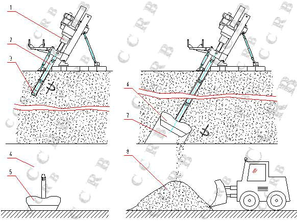 1-反井钻机,2-钻杆,3-导孔钻头,4-下水平巷道,5-等候装接的扩孔钻头,6-扩孔工作中的扩孔钻头,7-扩孔后的导井井筒,8-自由落下的岩碴。
